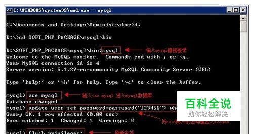 另外打开一个cmd窗口, 依次输入以下命令,将root账户密码重置为123456。(命令输入部分用红色标注) mysql mysql>use mysql; mysql> update user set password=password("123456") where user="root"; mysql>flush privileges; exit 如图: