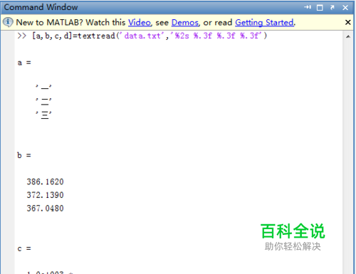 除了上面介绍的函数以外,还可用textread函数来读取。用该函数时可指定每部分输出内容的格式,具体用法为 [a,b,c,d]=textread('data.txt','%2s %.3f %.3f %.3f') 其中,textread第二个引号里面代表的是输出内容的格式,例如%2s代表第一列输出格式是元胞数组形式,%.3f代表输出数字保留3位小数