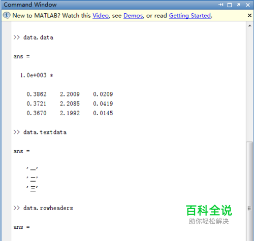 接下来,我们用importdata这个函数来读取文件,例如,我要读取一个文件名为data的文本文件,可以在命令窗口输入: data=importdata('data.txt')
