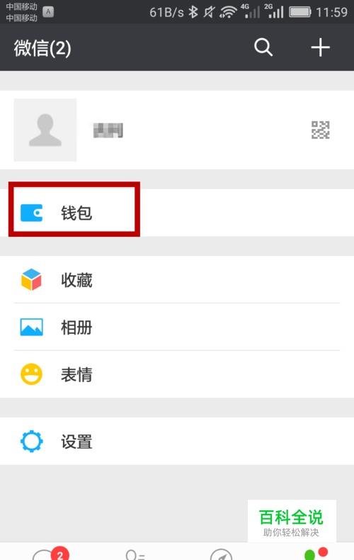 打开手机端微信APP,输入账号密码进入微信主页,找到如图位置“钱包”