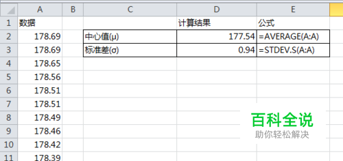 假设有这样一组样本数据,存放于A列,首先我们计算出样本的中心值(均值)和标准差。 如下图,按图写公式计算。为了方便对照着写公式,我在显示“计算结果”旁边一列列出了使用的公式。 公式直接引用A列计算,这样可以保证不管A列有多少数据,全部可以参与计算。因为是做模板,所以这样就不会因为每次样本数据量变化而计算错误。 Excel在2007版本以后标准差函数有STDEV.S和STDEV.P。STDEV.S是样本标准偏差,STDEV.P是基于样本的总体标准偏差。如果你的Excel里没有STDEV.S函数,请使用STDEV函数。