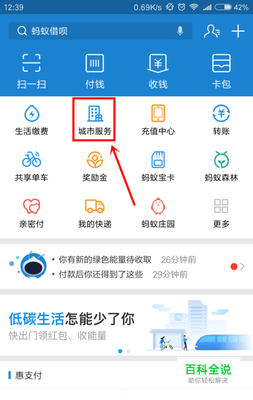 如果在主界面找不到“城市服务”,点击主界面上方的输入框进行搜索: