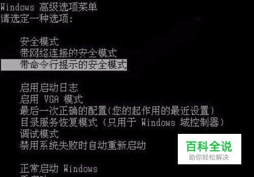 按下计算机电源,启动计算机。在启动过程中,一直按住按住F8键,直到出现 下图所示,选择“带命令行的安全模式”。