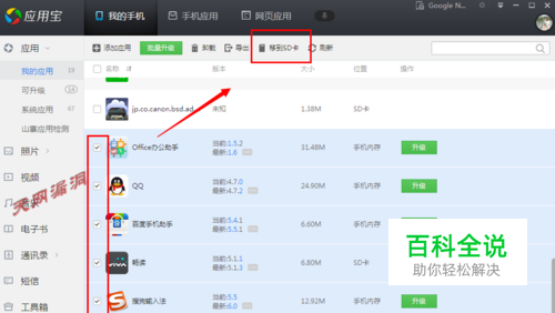 等待检测完已经安装的应用后,在想要移动到SD卡的应用前打上对勾,然后点击上面的移动到SD卡,这时应用宝会一个一个的把选中的应用移动到SD卡,根据应用的多少和大小,移动的时间不一样。