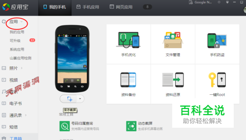 将手机与电脑相连,打开电脑管家里的应用宝程序,看到手机已经连接再进行操作。
