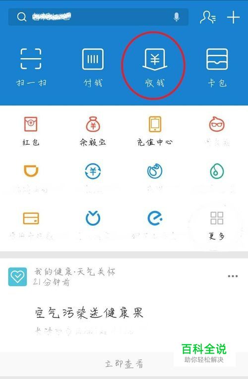 首先,打开支付宝首页,点击上面的“收钱”(如图);