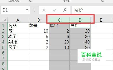 首先选中单价一列的同时按Ctrl键同时选中总计这一列。