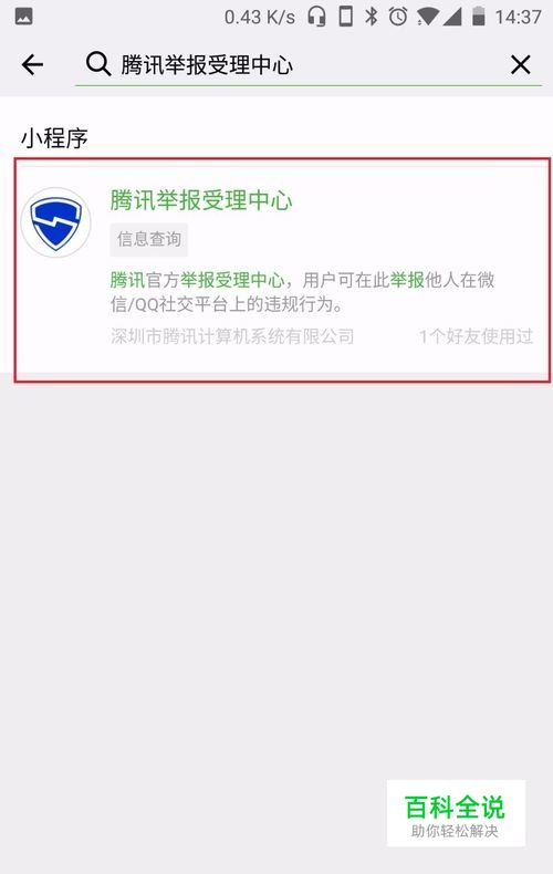 然后在小程序搜索中搜索 腾讯举报受理中心,点击进入