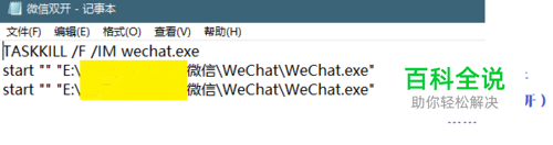 ① 在桌面新建一个文本文档,(桌面空白处)右键—新建—文本文档。 ② 在文档里输入以下内容: TASKKILL /F /IM wechat.exe start "" "E:\……\WeChat\WeChat.exe" start "" "E:\……\WeChat\WeChat.exe"