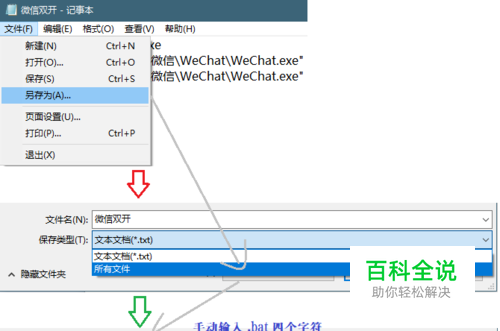 文件—另存为—【所有文件】—在文件名后手动输入 .bat 四个字符—保存,如图。