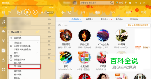 我们先打开酷狗音乐,在酷狗音乐面板中的歌曲列表中,我们把鼠标放到任意一个播放列表上,然后右击鼠标,选择“导出列表”,选择保存路劲,单机“确定”就把歌曲列表导出来了。