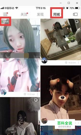 打开并登录快手,点击同城,进入直播间(有“LIVE”标志的)。