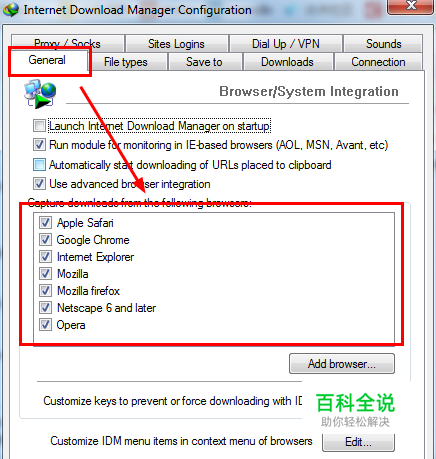 如果某些浏览器是你在安装IDM后才装上的,那么需要加载到IDM中。方法是: 设置 -->一般--> 从以下浏览器捕捉下载 -->添加浏览器 。然后找到浏览器的安装文件夹中的 浏览器启动程序。