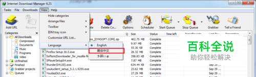 在网上下载IDM,这个软件在网上基本都有破解版的。安装。打开有得到如下界面,可以通过 view -->language -->简体中文 将界面的显示语言改为中文。