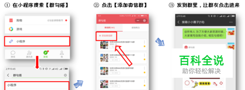在微信中搜索“群勾搭”小程序,打开后,在群组里选择【添加微信群】,发到微信群里,让群友们点击进来
