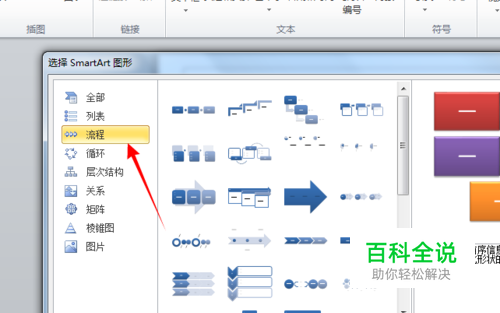 弹出选择smartart图形窗口,里面有各种不同类型的流程模版,点击“流程”