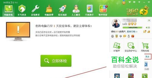 打开360安全卫士,在工具栏点击“更多”(或者已安装“重装系统”的可以直接点击)