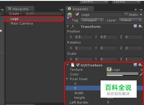 制作开头loading时的Logo界面,4秒后进入下一个界面: 建一个空Project,将屏幕分辨率改为800*600. File--->Build Settings...----> PC and Mac Standalone---> Player Settings...---> Resolution and Presentation 创建一个GUI Texture,重命名为Logo,然后Logo图片放到这个GUI Texture上,修改其参数如下: