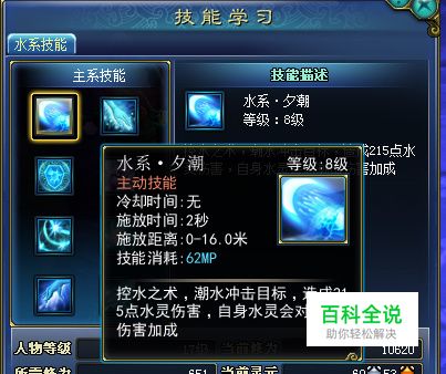 汐潮~~~是水系第一个技能,耗蓝,62,dps技能。前期只能攻击,后期有减速的效果。减速效果由于等级有限不能详细统计,我任务等级41的时候这个技能点满,能减速百分之30~~~用于辅助输出,野战偷袭还是很好用的