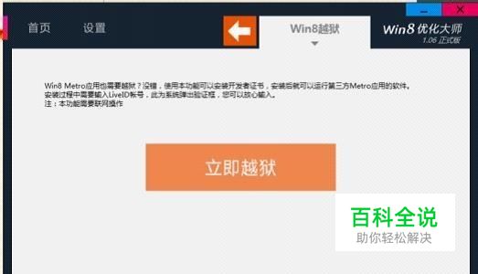 首先需要安装win8优化大师,接下来就是使用Win8优化大师一键越狱: 1.打开Win8优化大师,点击Win 8一键越狱; 2.点击立即越狱; 3.点击我同意,因为我这里已经越狱过了,所以说是续订,没有越狱过的方法都一样; 4.输入账号密码,点击Sign in(登陆);(这个账号密码大家都有,一般安装 Win 8 的时候都注册了的,不然用不了win8的应用商店) 5.然后就是这样(之间好像还有课申请什么的,点击就行了),我的越狱过,是续订,所以显示的内容有些不一样,但是步骤是相同的,等着完成 6.成功的话就会显示以下界面(可能会提示出现错误,重试就行了),然后点击关闭。 7.越狱完成,但是时间是有限制的,到期后按照上述方法续订就可以了。