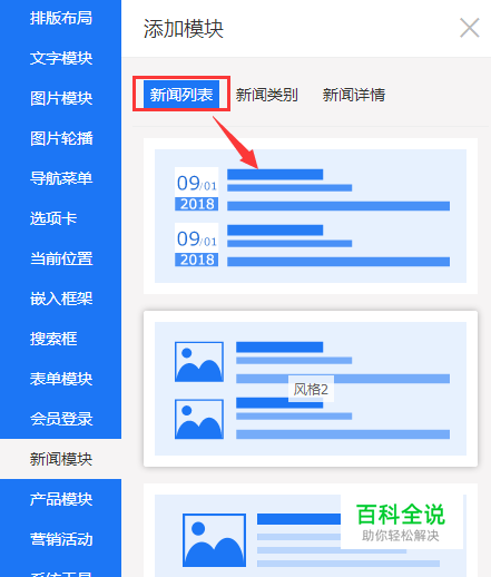 ④如果模板网站中没有新闻模块,可以在新增模块中选择“新闻模块”,在新闻列表子栏目下选择合适的模块拖拽出来即可设置。
