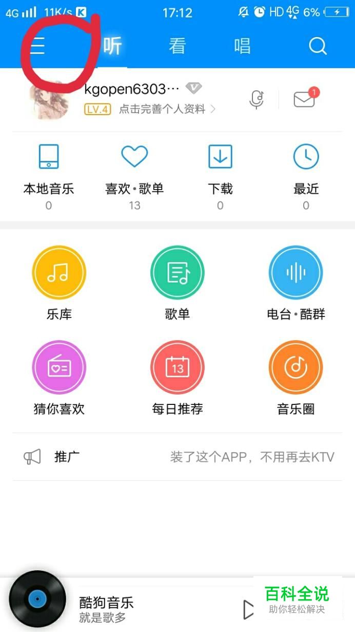 首先打开酷狗音乐,然后点击左上角的三条横线。