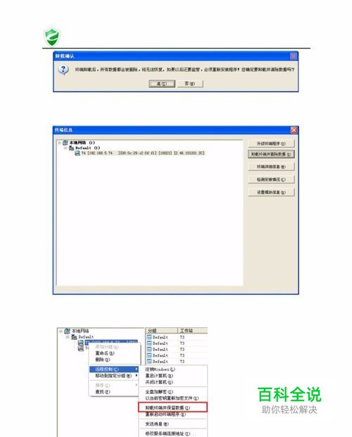 选中要删除的终端(可以按本地网络、分组或终端),然后点击窗口右侧的“卸载终端并删除数据”,弹出“卸载确认” 窗口。 选择“是”开始卸载终端。卸载成功之后,该终端在“终端信息”中去除(在服务 器上删除该终端信息),终端电脑上绿盾终端被卸载。 也可以在控制台的用户列表中, 右键终端—远程控制—卸载终端并保留数据, 这样 的方式卸载终端,不删除终端信息。之后在控制台上该终端将显示红色“ +”号图标。