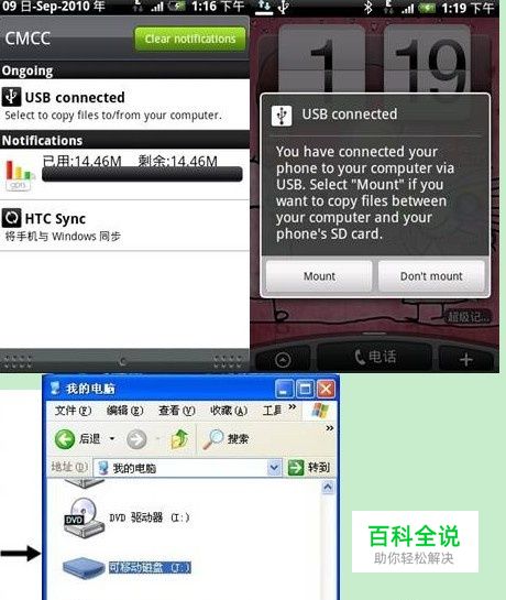 用数据线将手机连接到PC机后,在手机上选择“USB connected”项,待电脑找到新设备后,双击打开“可移动磁盘”