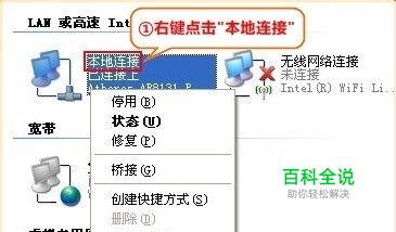 第二步:右键点击“本地连接”,选择“属性” 注意:如果想配置无线网络ip,右键点击“无线网络连接”选择“属性”