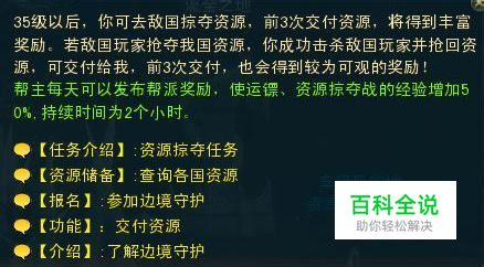资源掠夺任务流程 在每日资源掠夺任务开放后,所有35级以上的玩家即可在资源掠夺的地图中找到资源管理者接取守护边境任务。