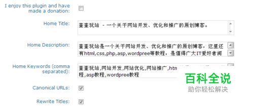 在选项菜单里面找到all in one seo选项,把里面的空白内容填完。