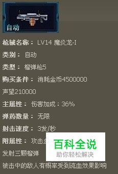 枪魂魔炎龙-I枪械属性解析 枪械名称: LV14 魔炎龙-I 类别: 自动 类型: 榴弹枪5 购买条件: 消耗金币4500000 声望210000 主属性: 伤害加成:36% 弹药数量: 无限 射击速度: 3发/秒 附属性: 攻击多个敌人 发射三颗榴弹 被击中的敌人有概率受到流血效果影响