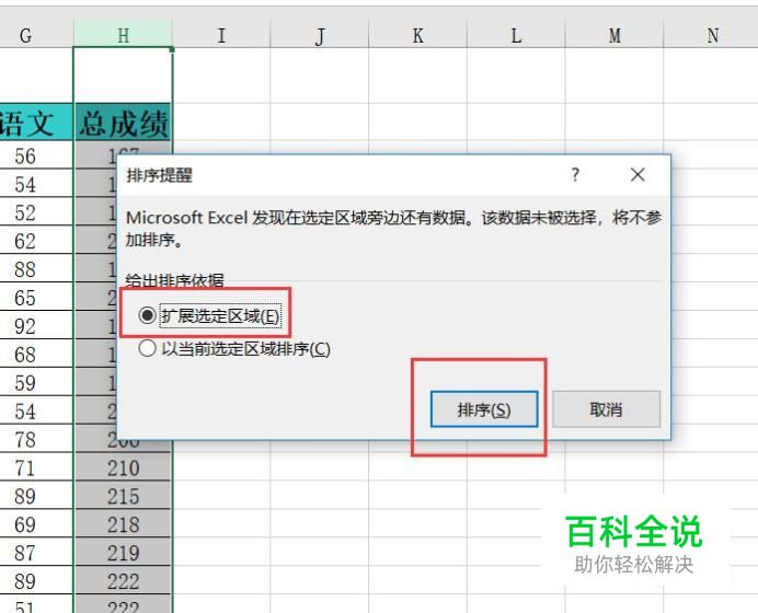 接下来,我们点击“扩展选定区域”按钮,点击“排序”选项。