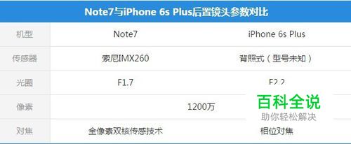 这次三星Galaxy Note7同样是采用了1200万像素的Dual Pixel摄像头(全像素双核技术),国行版的传感器为IMX260,像素尺寸1.4µm,拥有手机当中目前最大的F1.7光圈,并支持光学防抖功能。 苹果iPhone 6s Plus的后置摄像头相对于前代作品有一定的改进,拥有优化的局部色调映射功能,像素为1200万,支持相位对焦,传感器为背照式设计,但具体参数未知。镜头光圈F2.2,支持光学防抖。