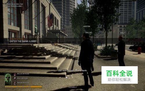 这是一款打劫游戏,上图这三位同学就是同党,这次的目标是一间银行! 打劫第一件事是什么?当然就是进去大叫‘打劫’(按F)
