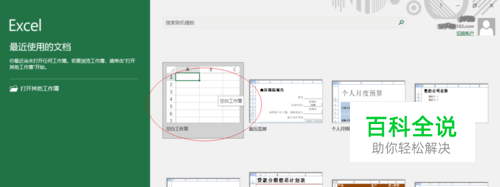 启动Excel 2016电子表格应用软件,如图所示点击屏幕右侧新建空白工作簿。