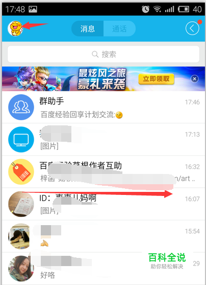 我们打开手机QQ以后,如图示,我们向右滑动或者点击左上角的头像。