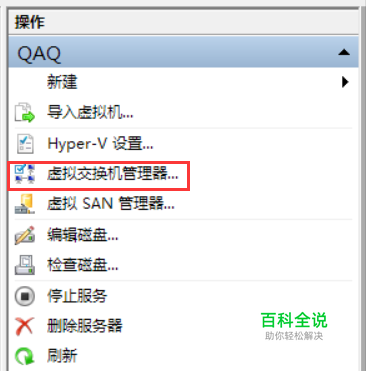 1.解决Hyper-V无法联网 Hyper-V并不能对物理机的网卡进行识别,所以需要借助虚拟网卡通过物理机的网络共享实现网络链接。 在关闭Hyper-V虚拟机的情况下,选择Hyper-V管理界面中的“ 虚拟交换机管理器”。