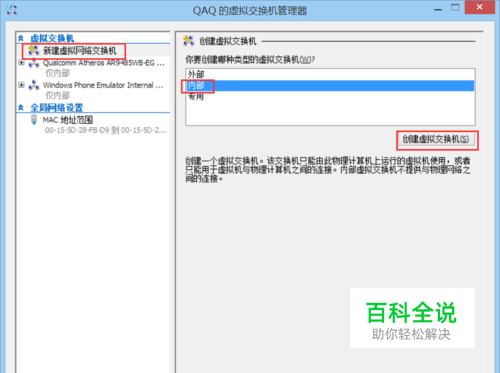 在弹出的对话框中选 “新建虚拟网络交换机”,选择“ 内部”,点击“ 创建虚拟交换机”。