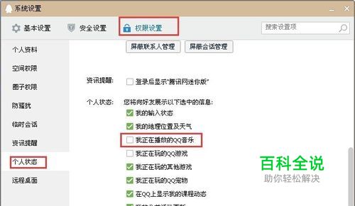先点击上方的权限设置,再点击左边的个人状态,然后将我正在播放的qq音乐前面的方框里的打勾去掉。这样好友的qq里就不会显示您正在播放的qq音乐了。