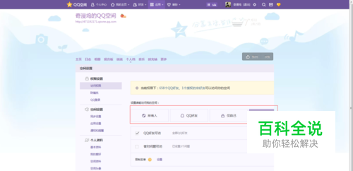 点击权限设置,就可以进入权限设置界面了,可以看到谁能访问我的空间下面有四个大选项,所有人,QQ好友,仅自己,自定义。