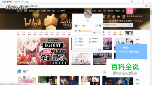然后将鼠标放在头像上,在弹出的窗口中点击“个人中心”,点击“账号安全”。