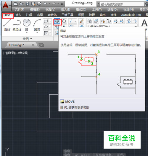 在不改变对象的方向和大小的情况下,按照指定的角度和方向进行移动。在菜单栏依次选择【默认】》【修改】》【移动】选项。