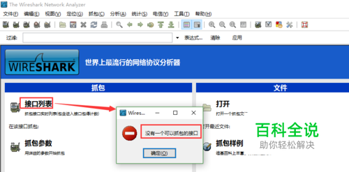 打开wireshark软件,点击“接口列表”,出现一个提示框,里面的文字是“没有一个可以抓包的接口”。