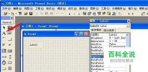 在桌面上,鼠标左键双击程序,在打开的VB6主界面上,左边是工具菜单栏,单击标签按钮,在Form1窗口上,绘制出一Label1,然后在其属性窗口上改个名字,如Caption为第一数,如下图所示。