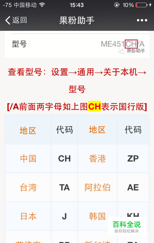 iPhone在世界各地都有销售,而且各地的价格都不一样,那么我们应该怎么来区别呢?这里给大家普及一个常识,中国地区的代码是CH,香港ZP,台湾TA,日本J,韩国KH,新加坡ZA,美国LL,这里就介绍几个大家购买较多的几个国家的代码。那么代码在哪里看呢,打开手机设置——通用——关于本机——型号。我们一般购买的都是国行的。