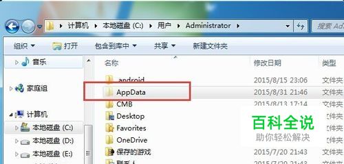 进入C盘->用户->当前登录计算机的用户名;假设当前登录计算机的用户是管理员Administrator,则径为C:\Users\Administrator,找到AppData这个文件,这里要注意他是隐藏文件,我们可以直接在地址栏输入C:\Users\Administrator\AppData调出它,就不用再去设显示隐藏文件的选项了.
