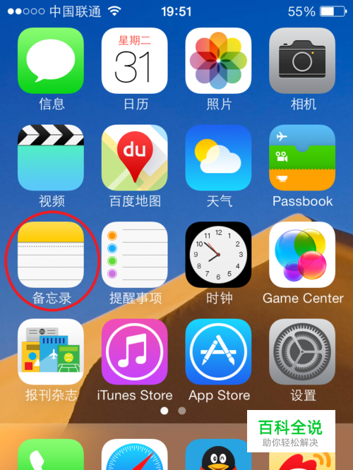 打开iPhone手机,进入主界面,找到备忘录(这里以备忘录为例,其实也可以打开短信功能,其他网页选择文字也可以)