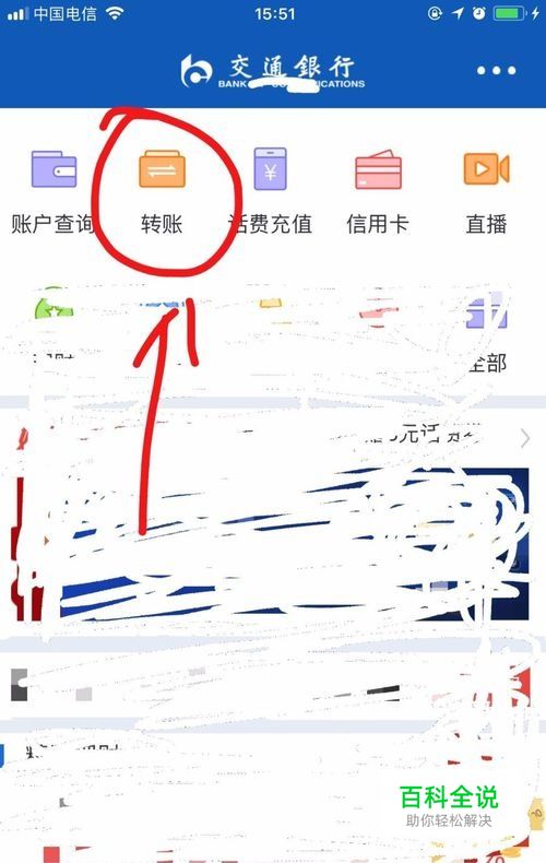 点击“交通银行”手机客户端文字进入到首页的界面。在界面中可以找到“转账”功能字样。如图