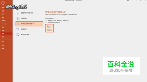 切换到“导出”选项,选择“将演示文稿打包成CD”,点击“打包成CD”。